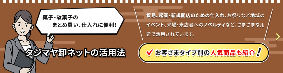 タジマヤ卸ネットは会員制の通販卸問屋です。菓子・駄菓子を中心に、カップ麺やパン、飲料などの各種食品や雑貨・日用品も豊富に取り揃えています。問屋価格・卸値での商品仕入れやまとめ買いに最適。業務用や、激安・格安な特売品、アウトレット品も多数用意しています。
